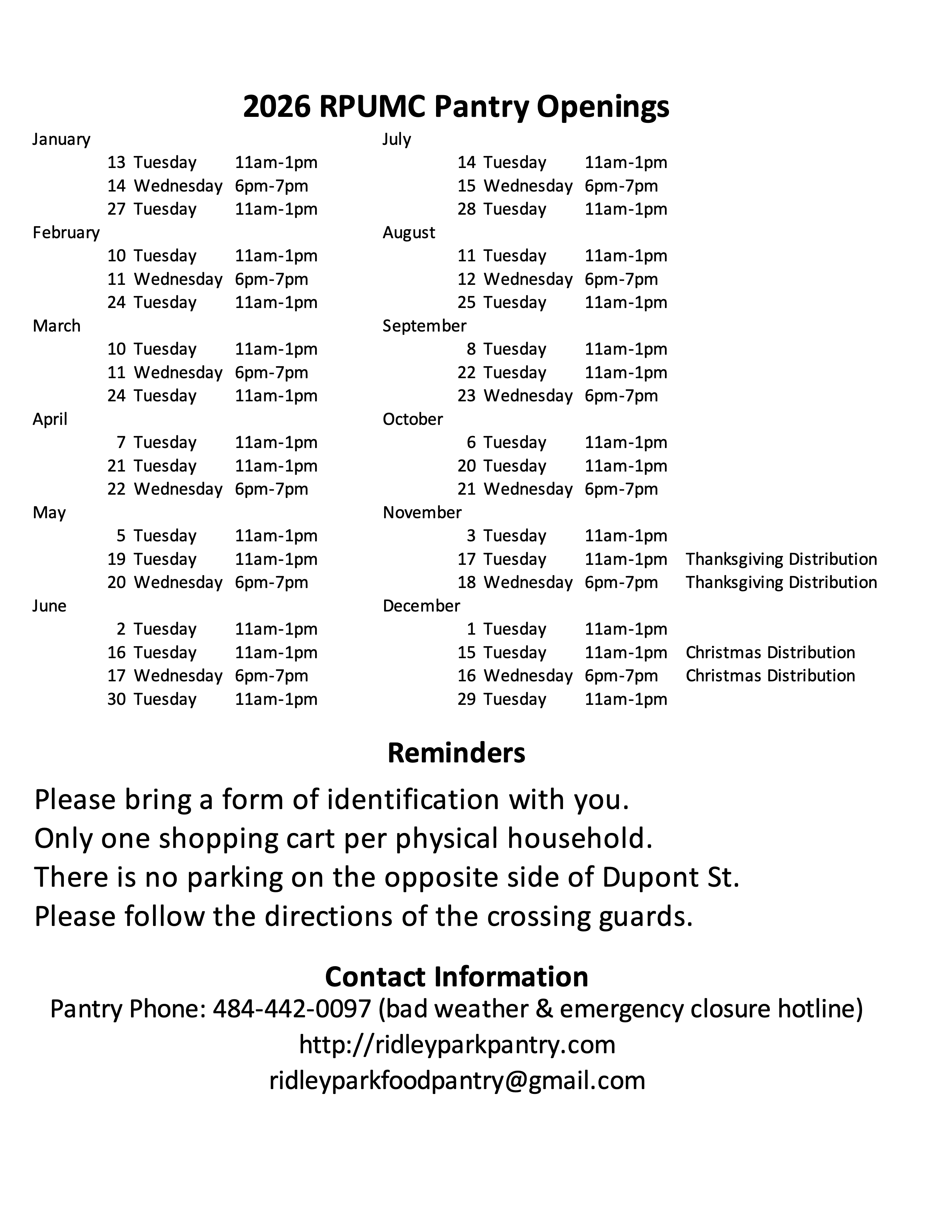We accept checks made out to "Ridley Park United Methodist Church" with "food pantry" written in the Memo. We also accept grocery store gift cards, or you can PayPal to ridleyparkfoodpantry@gmail.com.